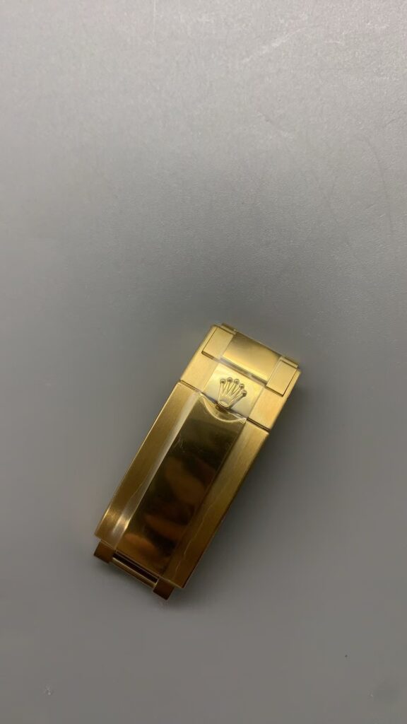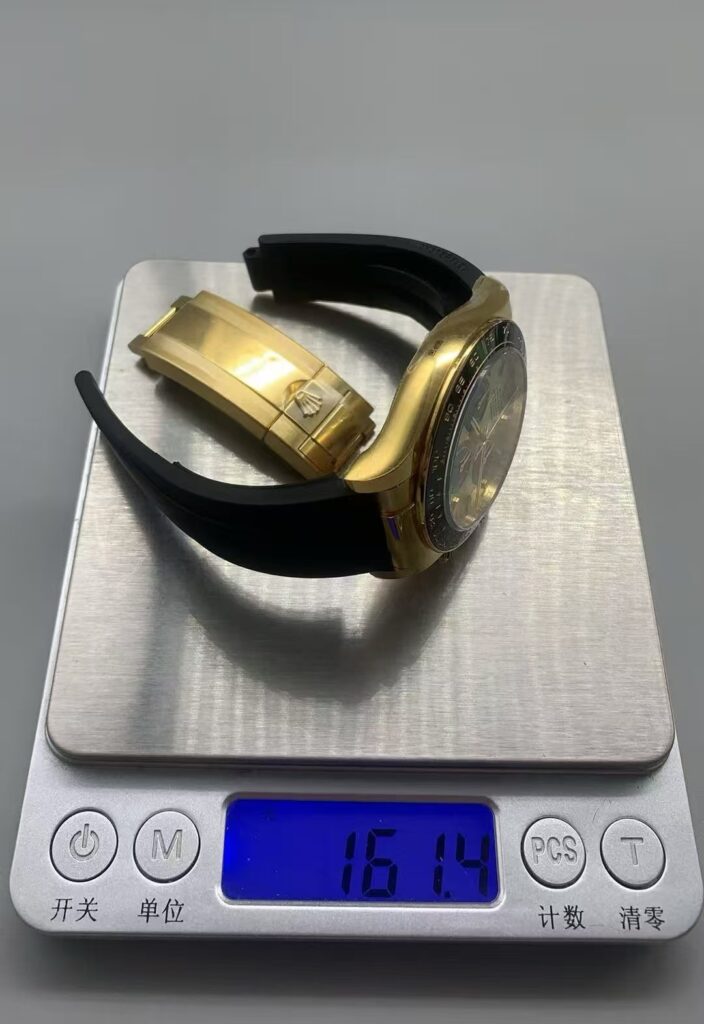 AR工場のロレックス ディトナ レプリカの最大のハイライトは、重量です。スケールの写真で示されている通り、161.4gという市場最重クラスです。VS工場の最新版が136g程度なのに対し、ARはデイデイト製作の経験を活かし、重量を大幅にアップデートしました。本物の重厚感を再現し、着用時の満足度が格段に上がります。金色のクラスプのクローズアップ画像を見れば、細やかな彫刻と滑らかな仕上げがわかります。このディトナ N級品は、単なるコピーではなく、素材の質感まで追求した結果です。