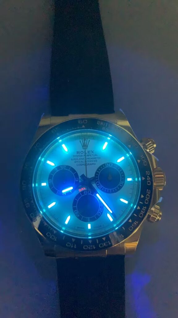 ダイアルのクローズアップでは、ベゼルの刻印(SWISS MADEなど)がシャープで、暗闇でのルミノバ発光は青く輝き、視認性抜群です。写真の暗闇ショットからも、針とインデックスの明るさが際立ち、夜間の使用に最適です。ストラップはブラックラバーで、柔軟性が高く、金ケースとのマッチングが絶妙です。全体像の画像では、別途の金クラスプが付属し、カスタムを楽しめます。